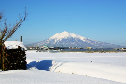 すっきりと晴れた早春の朝。青く輝く岩木山。白一色の裾野を辿(たど)ってゆくと、里の木々には綿帽子。