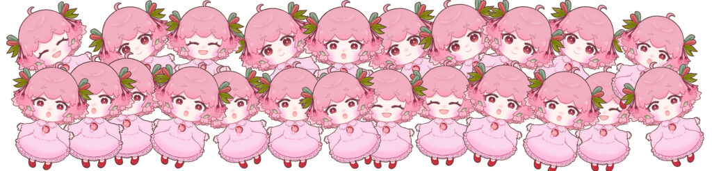 (べに)枝垂桜(しだれざくら)の花芽の先に、一人小さく隠れていたさくら子が「ぽん」とはじけて花開く。すると止まらず「ぽん」「ぽん」「ぽん」・「ぽっ」「ぽん」「ぽん」「ぽん」・「ぽっ」「ぽっ」「ぽっ」・「ぽん」「ぽん」ピンクのもこもこの花達があっという間に木を覆いつくす。