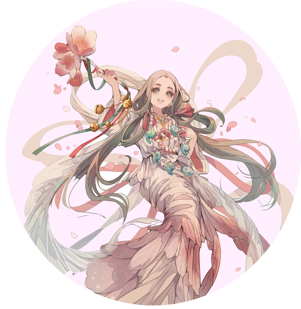 姫が降り下ろす枝の先から、さらに無数の花達が産まれ出で、光を受けて風に運ばれ、地上も天界もあらゆる花で埋め尽くされる。そわそわざわざわと花見に出かけた人間たちが余りの花の見事さに陶然と酔いしれる。その様子に嬉しくなって、姫は花見客の上にざあっと花の渦を巻きちらし、花枝の上を駆け回っては笑い転げる。